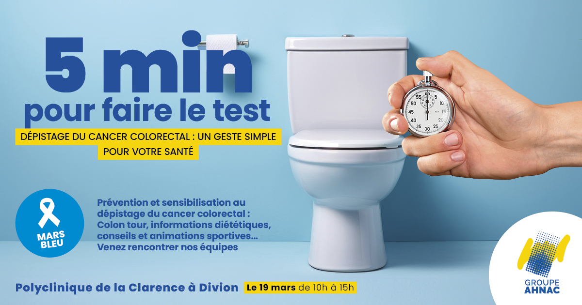 À l’occasion de Mars Bleu, mois national de sensibilisation au dépistage du cancer colorectal, la Polyclinique de Divion se mobilise et vous donne rendez-vous le 19 mars, de 10h à 15h, pour un événement dédié à la prévention et à l’information.